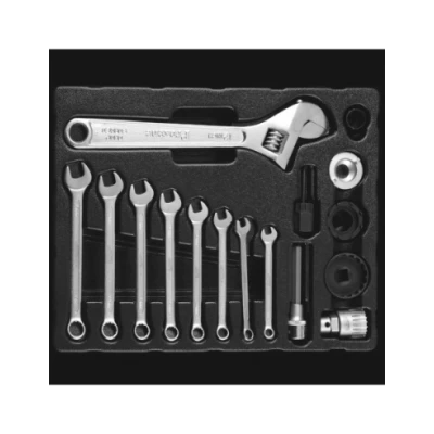 3 extractores de piñon; 3 Extractores de cazoletas cartucho pedalier; Casquillo H10 para Campagnolo® para llave dinamométrica de 1/2’’; 8 Llaves combinadas conos+Hex: 8-9-10-11-12-13-14-15 mm; Llave inglesa