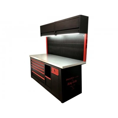 La línea MODOFLEX, fabricada íntegramente en Italia, ha alcanzado excelentes estándares de calidad en los últimos años y es apreciada mundialmente por la calidad de los materiales y la versatilidad modular. Este puesto de trabajo es específico para el mundo de la bicicleta, de 1,62m de anchura, con encimera de acero inoxidable, un gran panel perforado portaherramientas y 2 grandes armarios aereos con puertas abatibles mediante sistema de pistones hidráulicos. Ofrece un gran espacio de trabajo iluminado por 2 potentes tiras de luz LED. Sus medidas son perfectas para trabajar cómodamente, 90cm de altura y 80cm de profundidad. Esta versión ha sido diseñada con módulo de 5 cajones con 40cm de profundidad, 1 papelera y 1 módulo para rollo de papel con 1 cajón grande multiusos en la parte inferior.